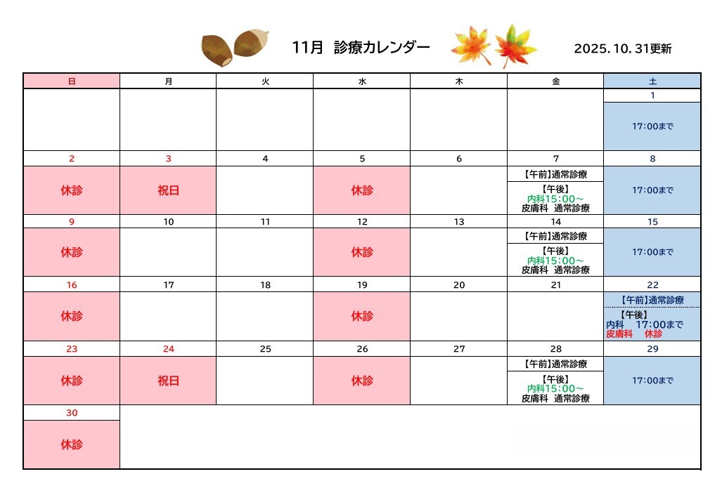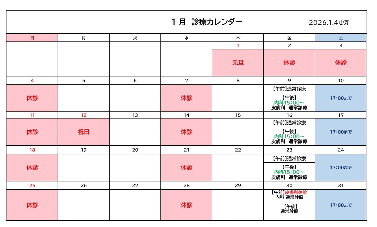 ■:内科のみ15時から診療開始の場合がございます。皮膚科は通常通り14時から診療を開始します。